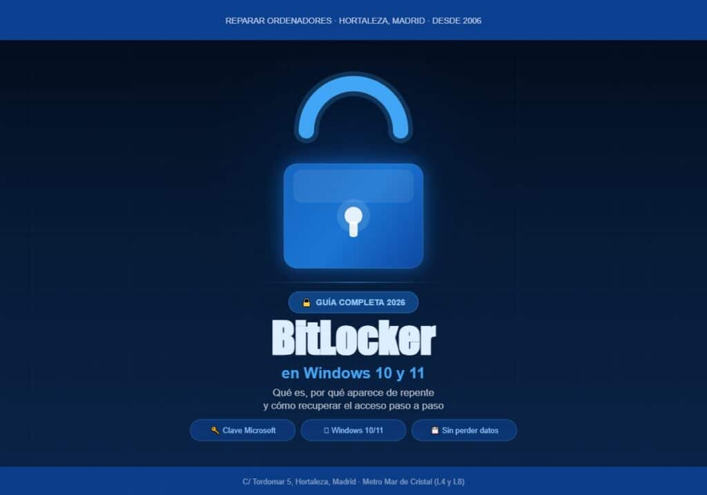 Has encendido el ordenador esta mañana y, en lugar del escritorio, aparece una pantalla azul con un candado pidiendo una clave de 48 dígitos que no recuerdas haber visto nunca. Dentro de ese disco están todos tus archivos, tu trabajo, tus fotos. Respira — tiene solución en la mayoría de casos. Esta guía te explica qué es BitLocker, por qué aparece sin que hayas hecho nada, y todos los métodos para recuperar el acceso, paso a paso.