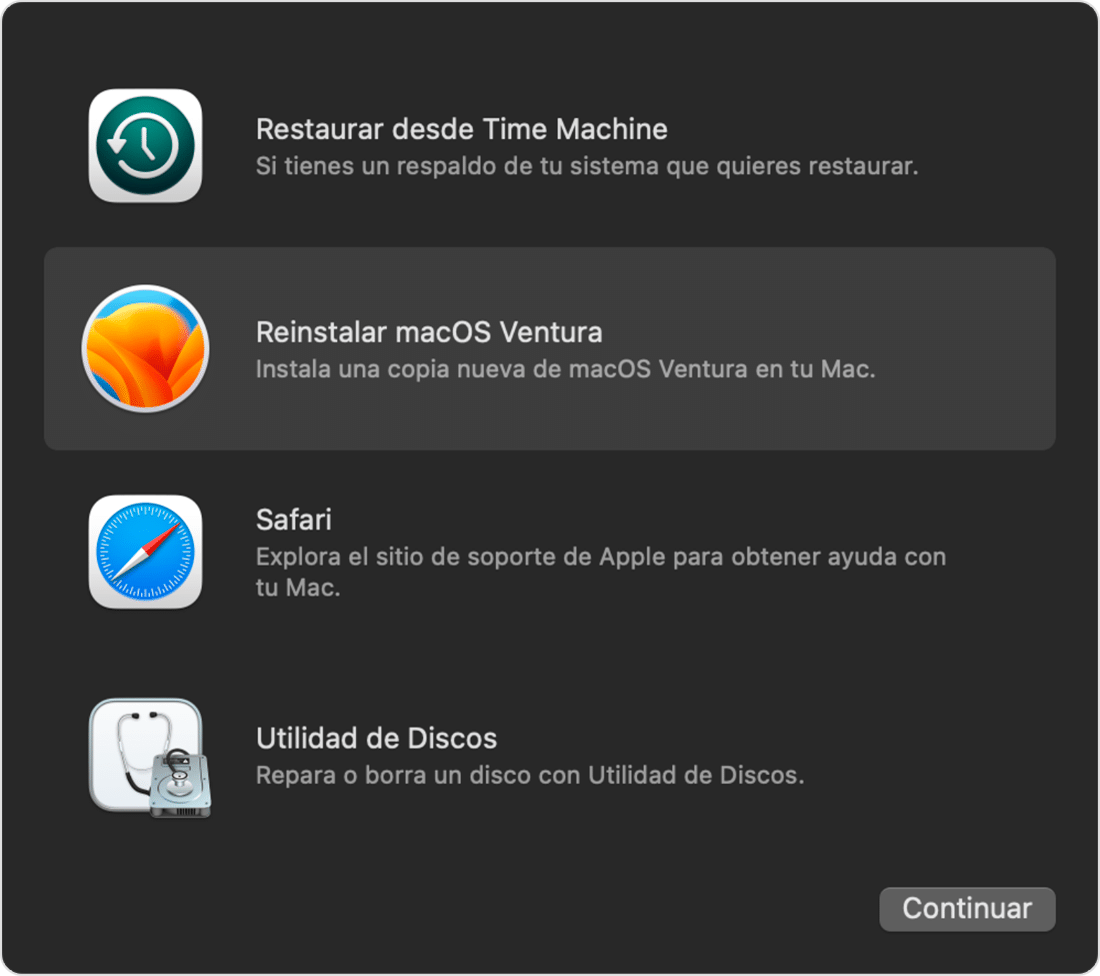 - Selecciona ‘Reinstalar macOS‘ pues así reinstalarás el sistema operativo sin perder tus datos personales.