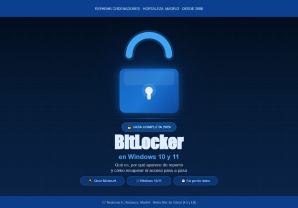 ¿Pantalla azul de BitLocker pidiendo una clave de 48 dígitos? Guía completa 2026: qué es BitLocker, por qué aparece solo en Windows 10 y 11, y cómo recuperar el acceso paso a paso sin perder datos. Con tabla comparativa, FAQ completo y solución por tipo de caso.