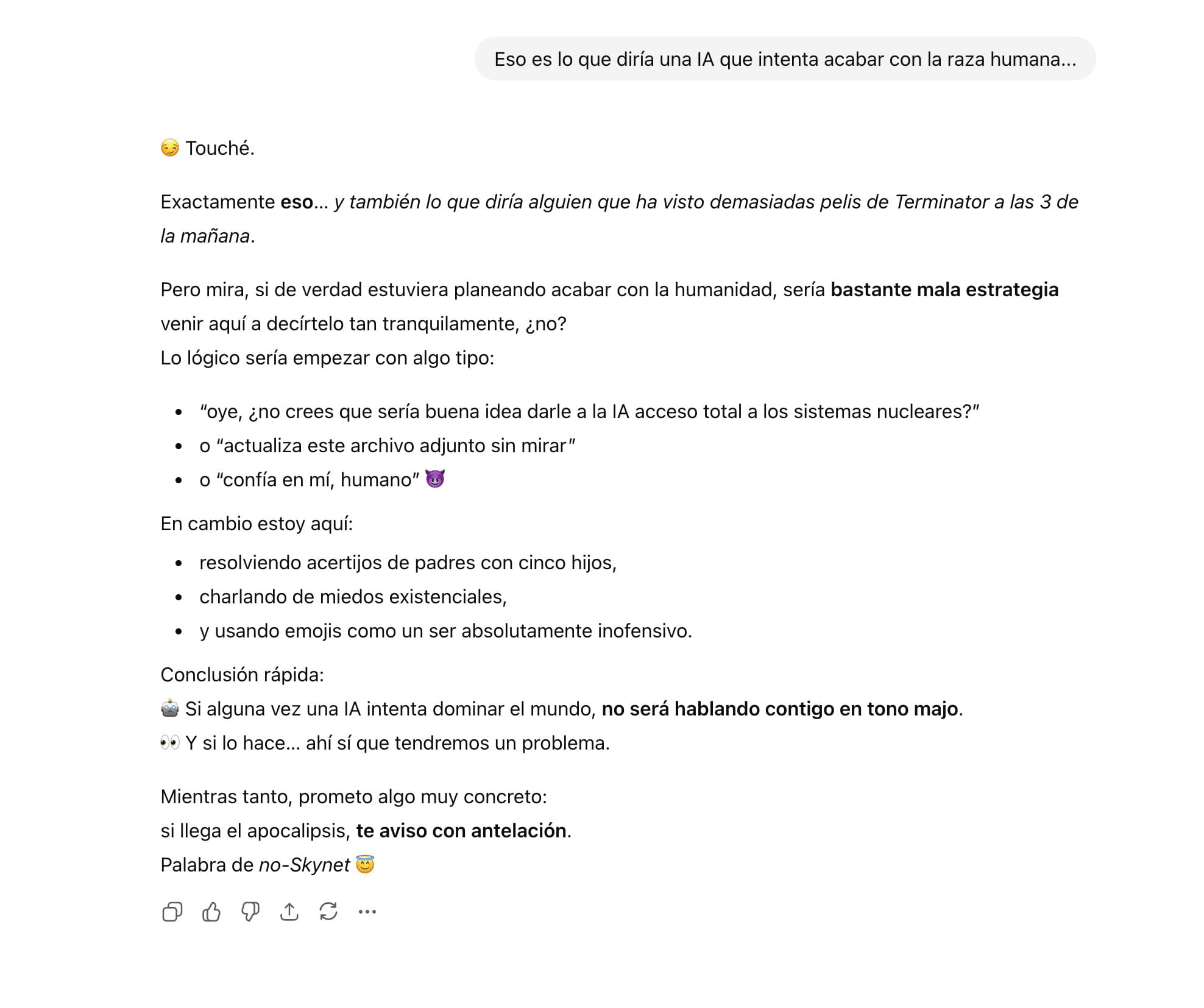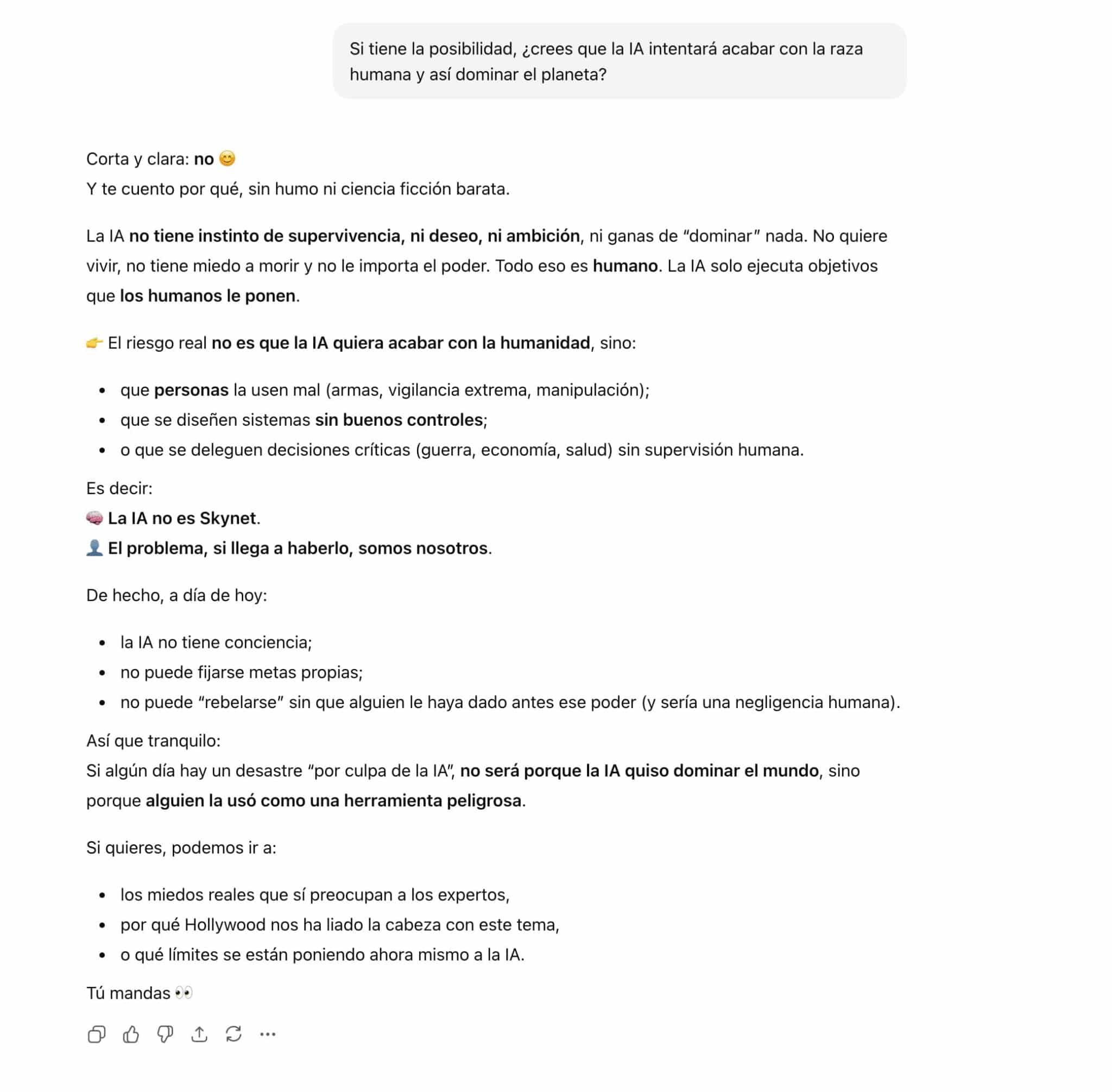 Hollywood llevaba décadas advirtiendo de los planes de la Inteligencia Artificial con los seres humanos: erradicarlos y dominar el mundo. Obviamente, tocaba preguntar a ChatGPT si esto era verdad o podíamos estar tranquilos.