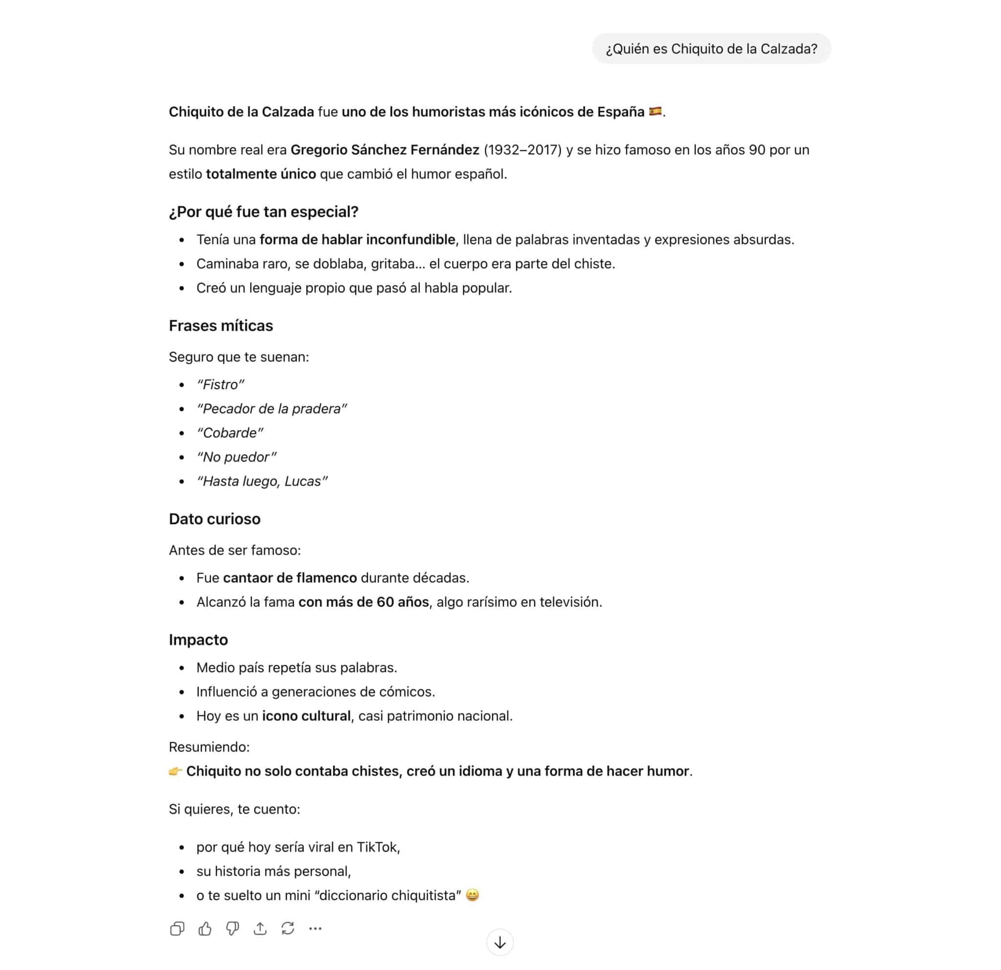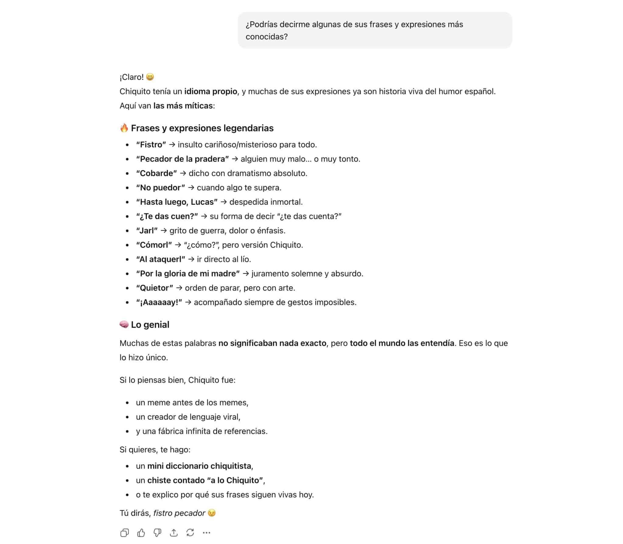 Lo más hiriente fue cuando le pedimos expresiones típicas de Chiquito de la Calzada y soltó perlas como «Me aburro que me caigo» o «Qué chiquito estás hoy«. Esta respuesta fue motivo suficiente para desactivar ChatGPT para siempre.