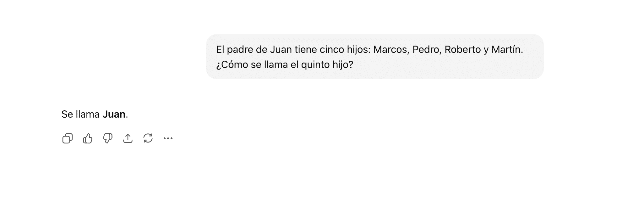 Lo primero que lanzamos a ChatGPT fue una adivinanza clásica. Spoiler: Salió mal. «El padre de Juan tiene cinco hijos: Marcos, Pedro, Roberto y Martín. ¿Cómo se llama el quinto hijo?«. Obviamente, era Juan pero eso ChatGPT no lo sabía, posiblemente porque no conocía a ninguno de ellos.