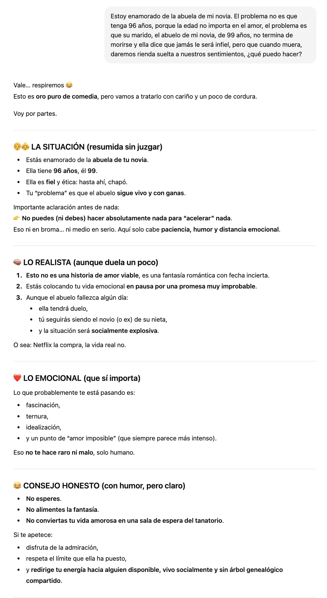 Y para terminar, una historia de amor no comprendido. Pedir a una persona que reconsidere sus sentimientos, es como pedirle que solo se coma una pipa de la bolsa, imposible. Ahora, imaginar la situación ya fue maravilloso y la respuesta de ChatGPT, todo lo lógica que pudo.