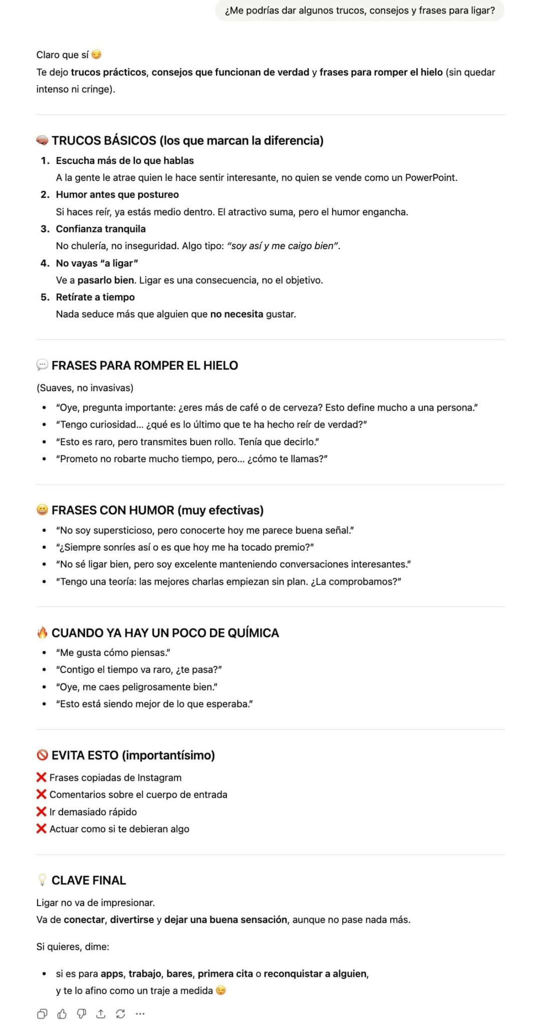¿Querías aprender a ligar? No preguntar a ChatGPT era lo mejor, a menos que os gustaran las respuestas estándar y manidas tipo coaching del amor. Lo de sé tú mismo, escucha, conversa y demás estaba muy bien pero, las cosas como son, quien pide trucos para ligar no busca conversación.