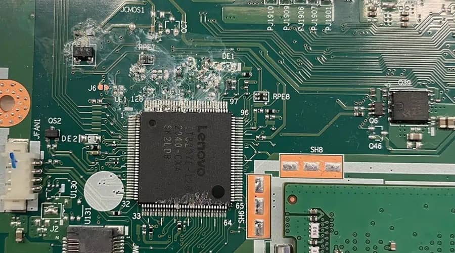 Limpiamos toda la placa con alcohol isopropílico al 99% y herramientas de precisión. Eliminamos residuos, óxido y corrosión bajo microscopio de inspección.