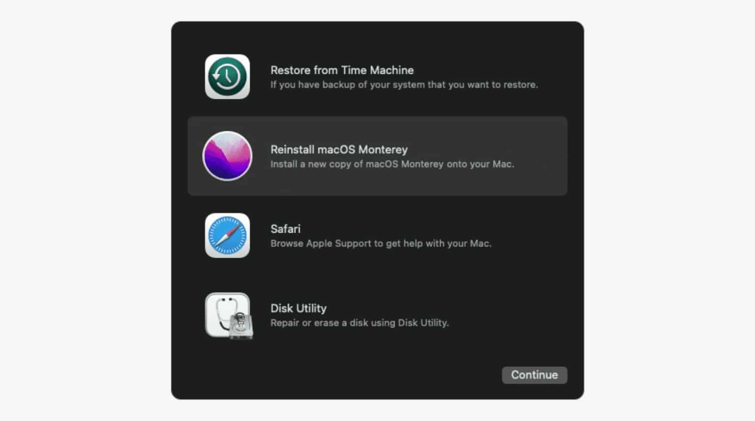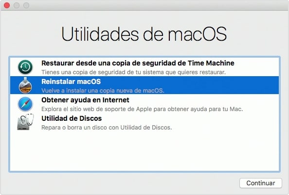 - Selecciona «Reinstalar macOS» y haz clic en «Continuar».